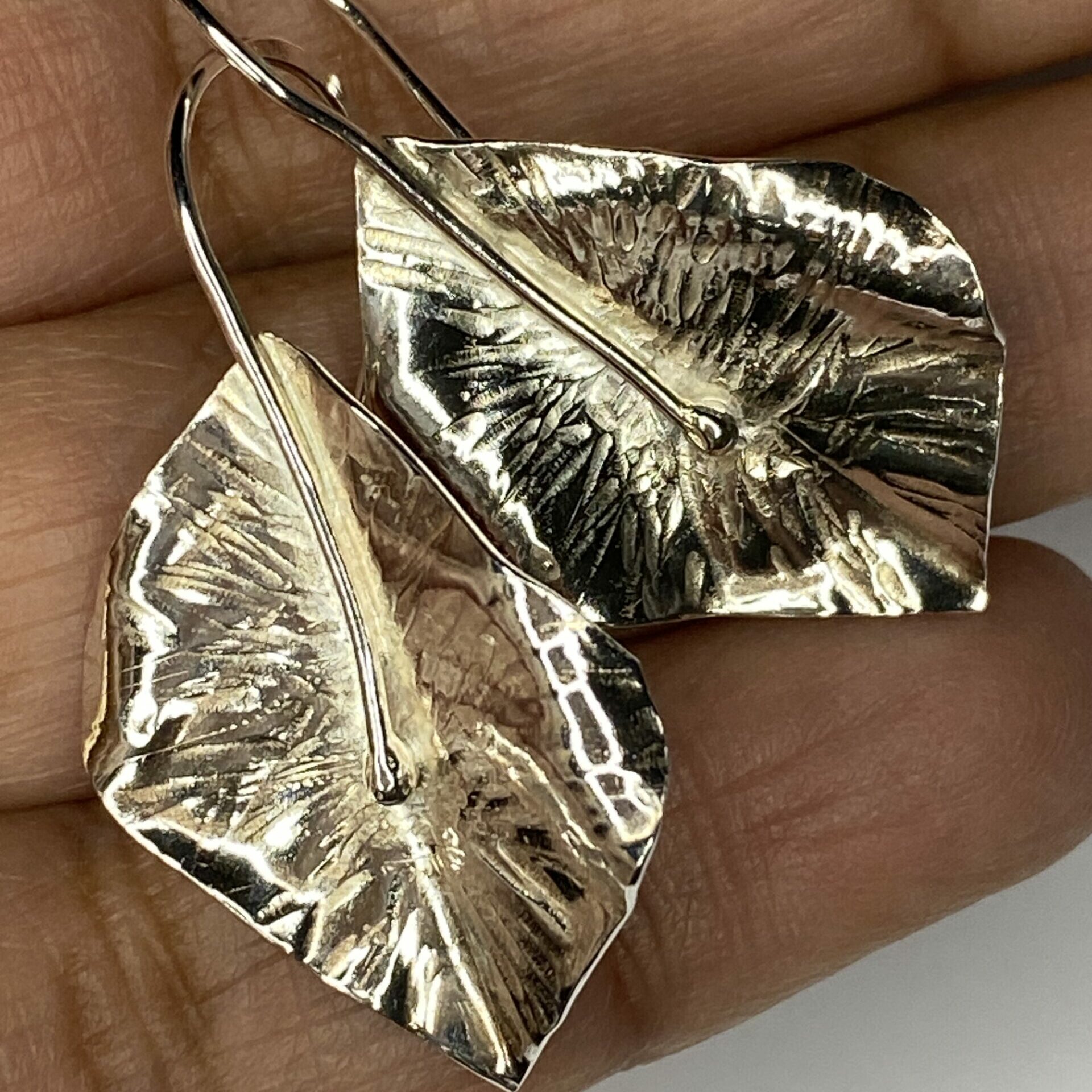 Sterling Silver Leaf Dangly Earrings, a stunning celebration of nature’s beauty. Delicate leaf motifs and hammered leaves exude sophistication, adding grace to any look. Versatile and comfortable for everyday elegance.