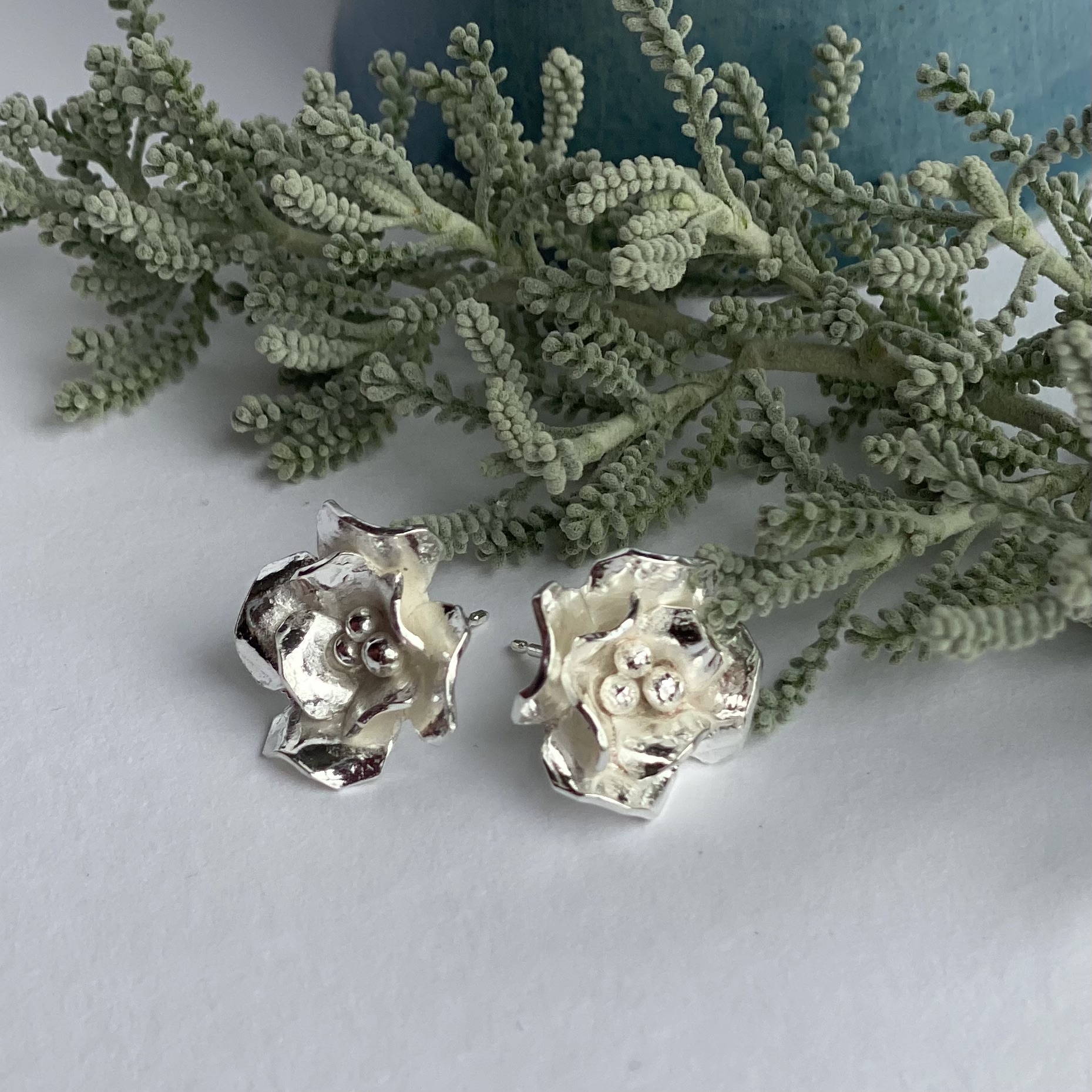 Inspired by the roses from my garden, these sterling silver stud earrings capture the simple elegance of a single bloom. Each petal is delicately shaped with fine texture to bring out natural depth and charm. Designed to sit comfortably and beautifully on the ear, they offer a timeless, versatile style that complements any look. Graceful and understated, a perfect pair for every occasion.