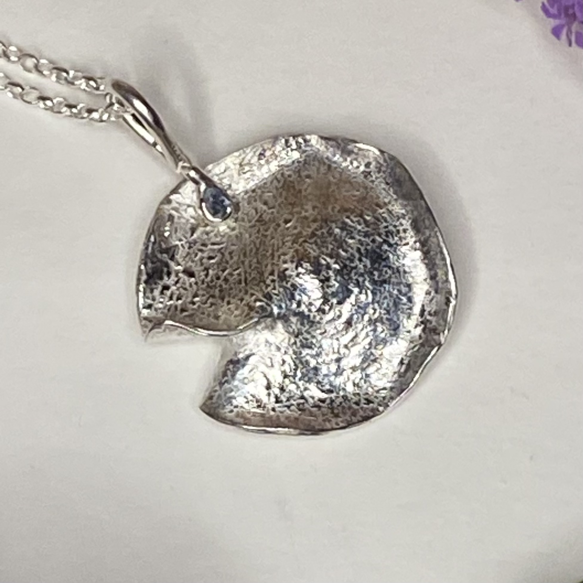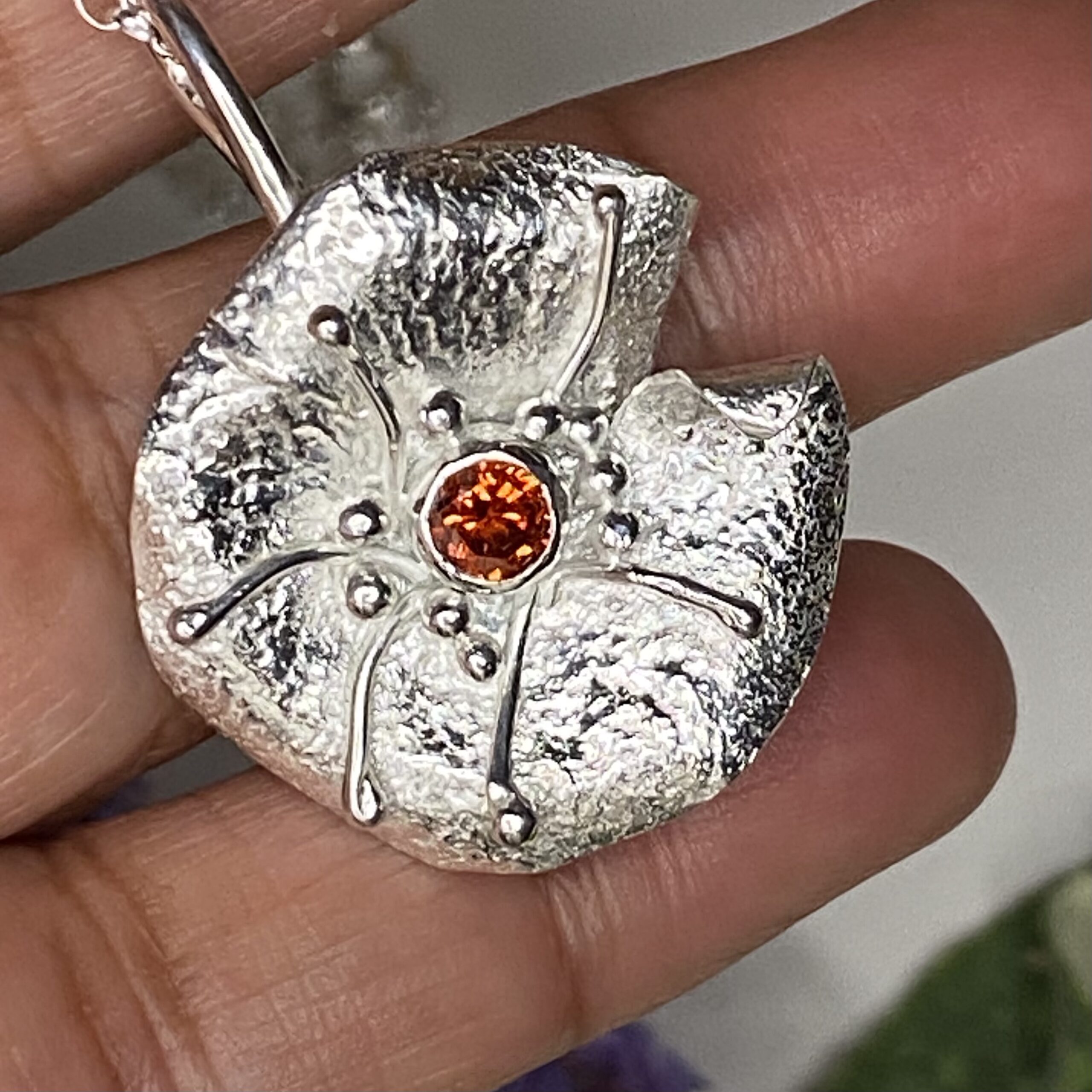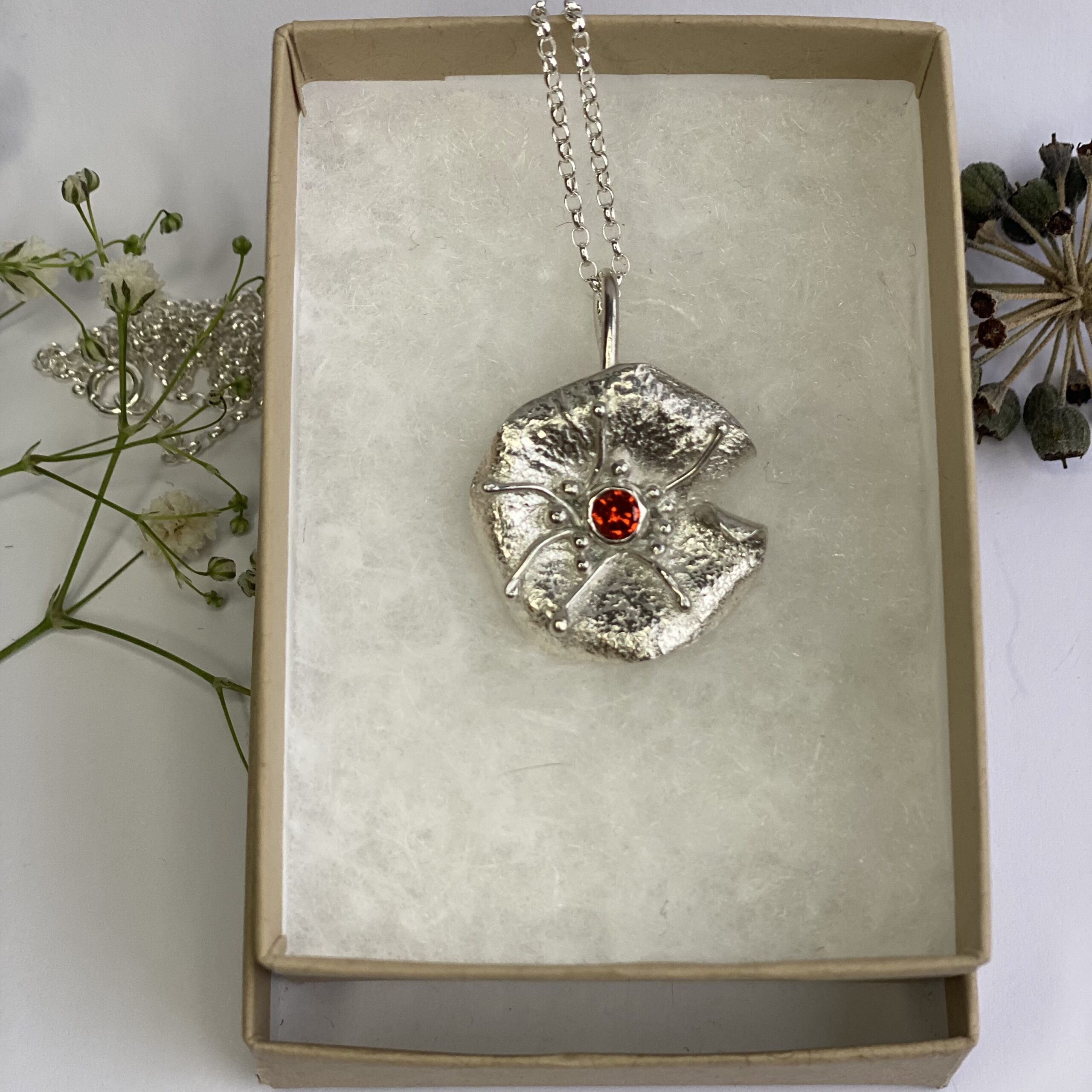 Pendant – This lovely sterling silver flower pendant features a textured and hand formed design with a carnelian coloured crystal at its centre, surrounded by delicate silver balls. A graceful piece for both everyday wear and special occasions. (Chain sold separately)