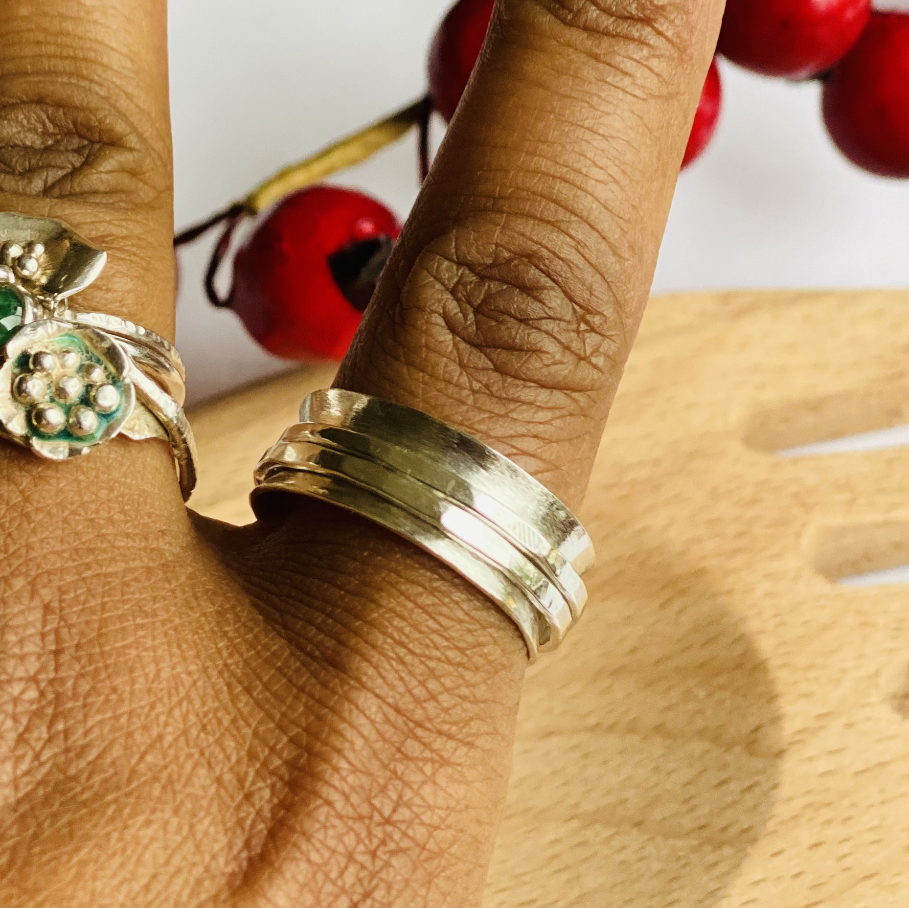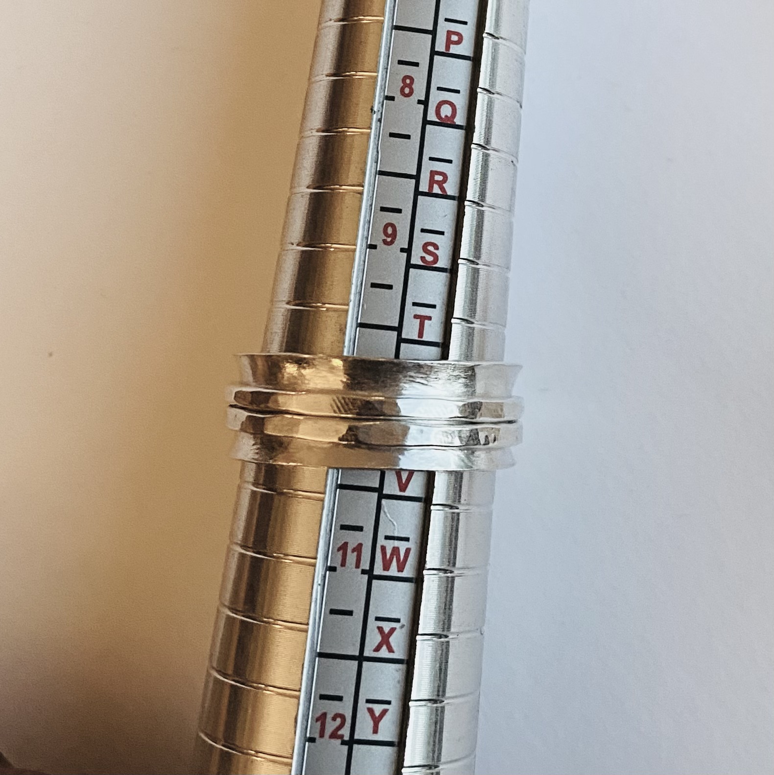 Ring -sterling silver fidget ring – a beautifully crafted, textured piece accentuated by two rotating silver wire rings. This beautifully crafted accessory not only exudes elegance but also offers a discreet and satisfying fidget experience.
