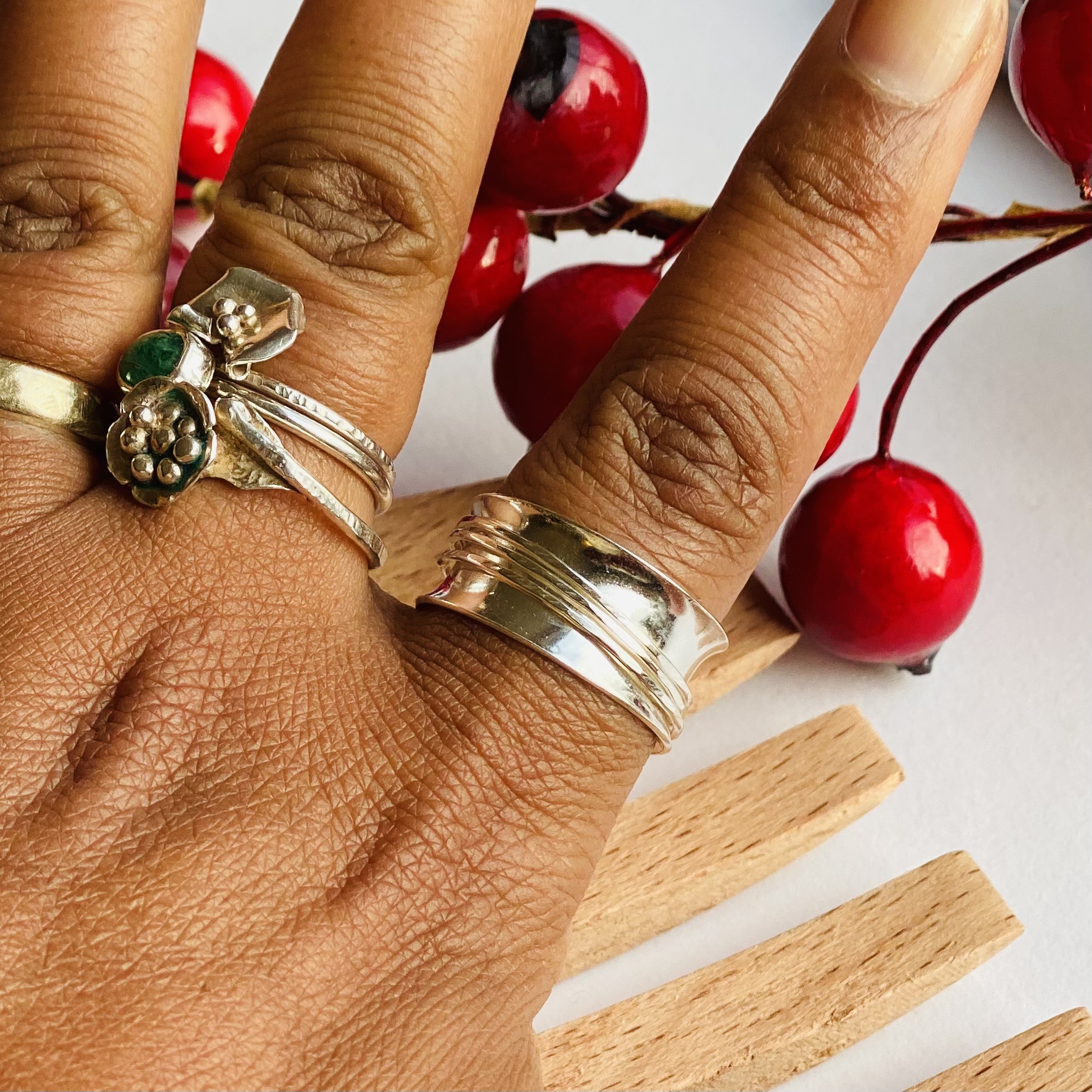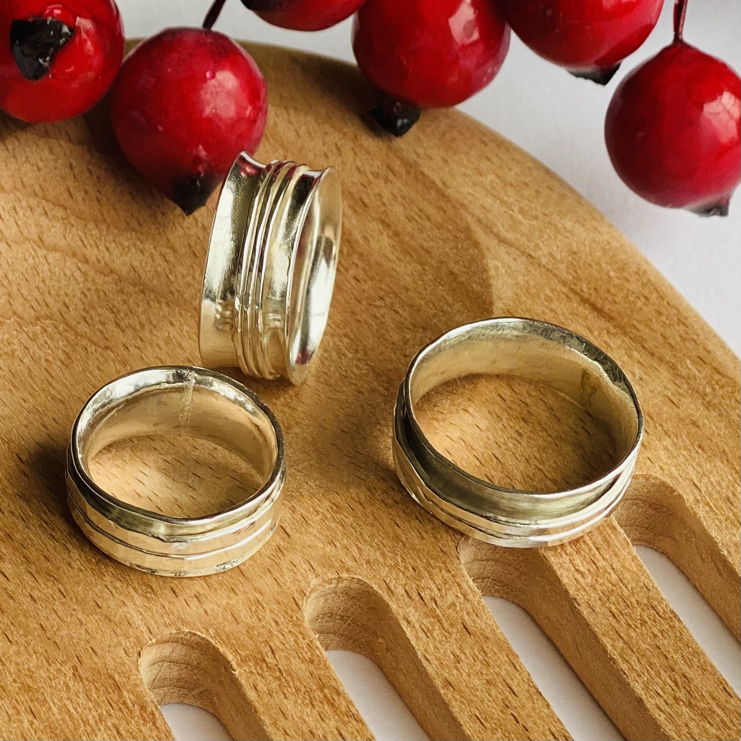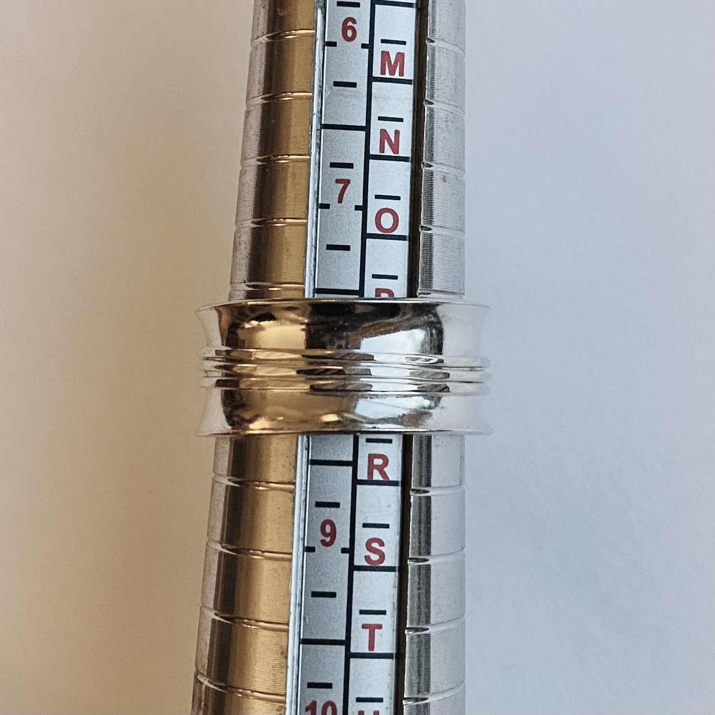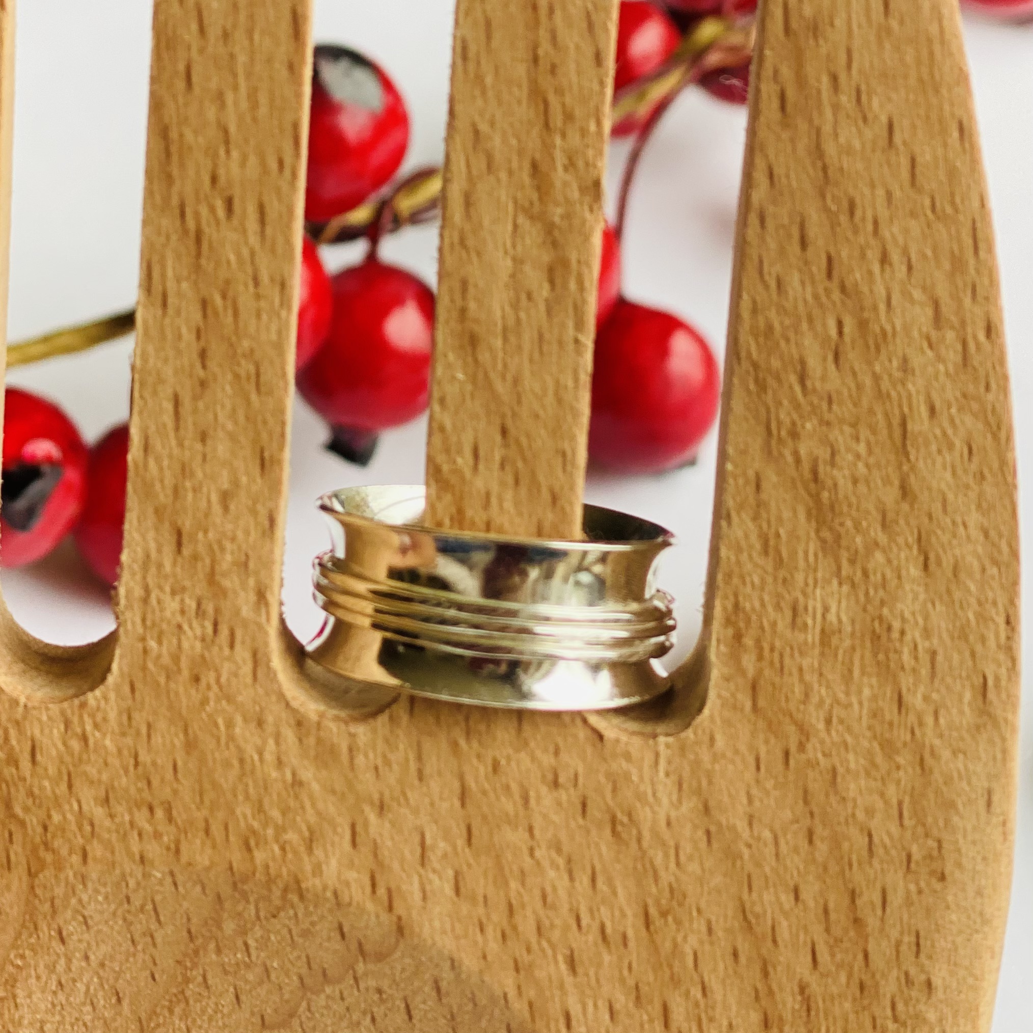 Ring -sterling silver fidget ring – a beautifully crafted, textured piece accentuated by two rotating silver wire rings. This beautifully crafted accessory not only exudes elegance but also offers a discreet and satisfying fidget experience.